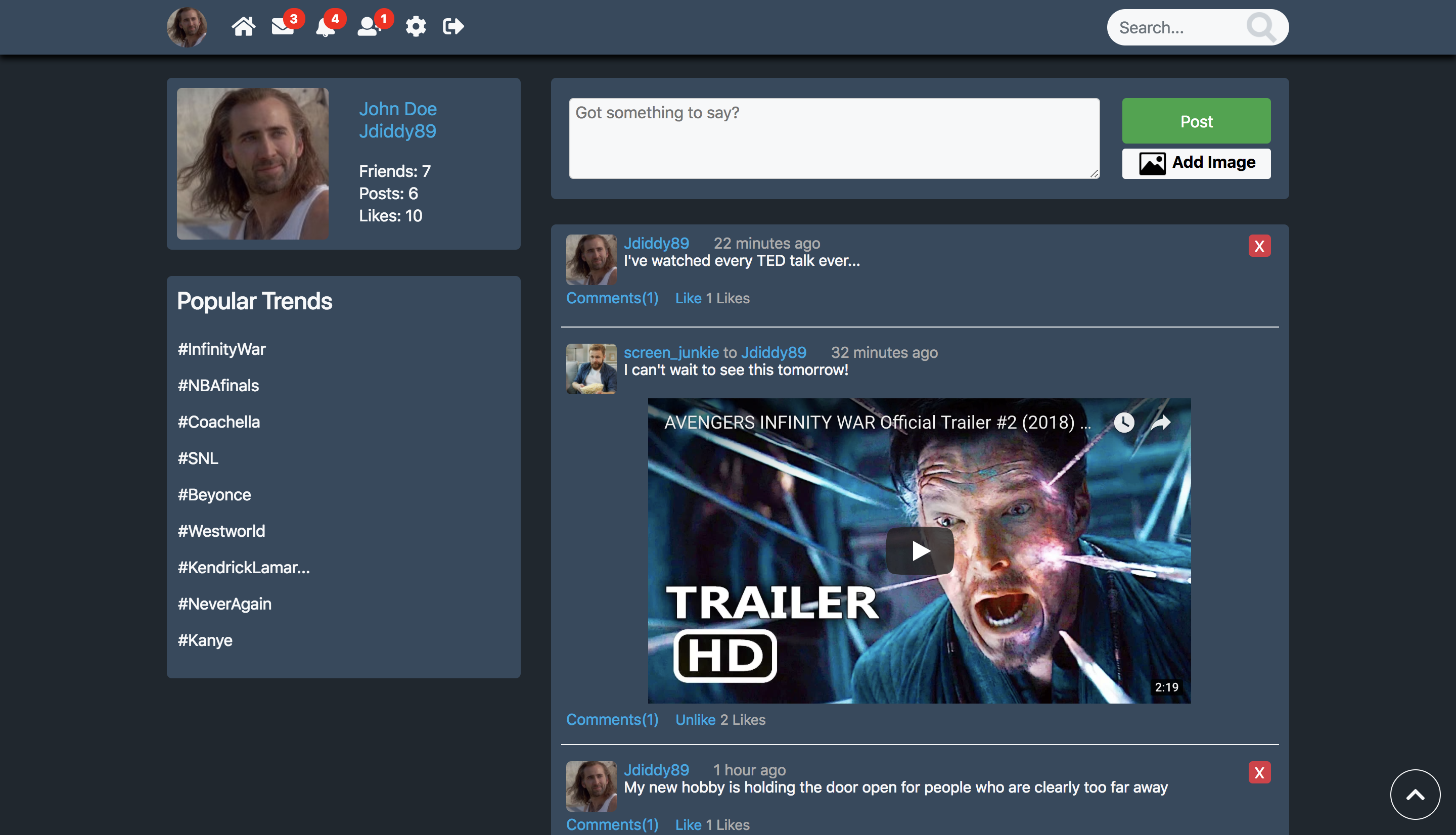 This is a Social Media Web App I made using the LAMP stack (Linux, Apache, MySQL, PHP) and a handful of other technologies and coding languages. The website functions much in the same way that many other social media sites like Facebook and Twitter function. A user can create an account, connect with friends, post on their profile, have a newsfeed of posts added by friends, in-app messaging, and many more features. I named it "Echo-Chamber" as a fun tongue-in-cheek jab at modern social media culture. The specific languages and frameworks I used to build this app are: HTML, CSS, JavaScript, PHP, MySQL, jQuery, AJAX, and Bootstrap.