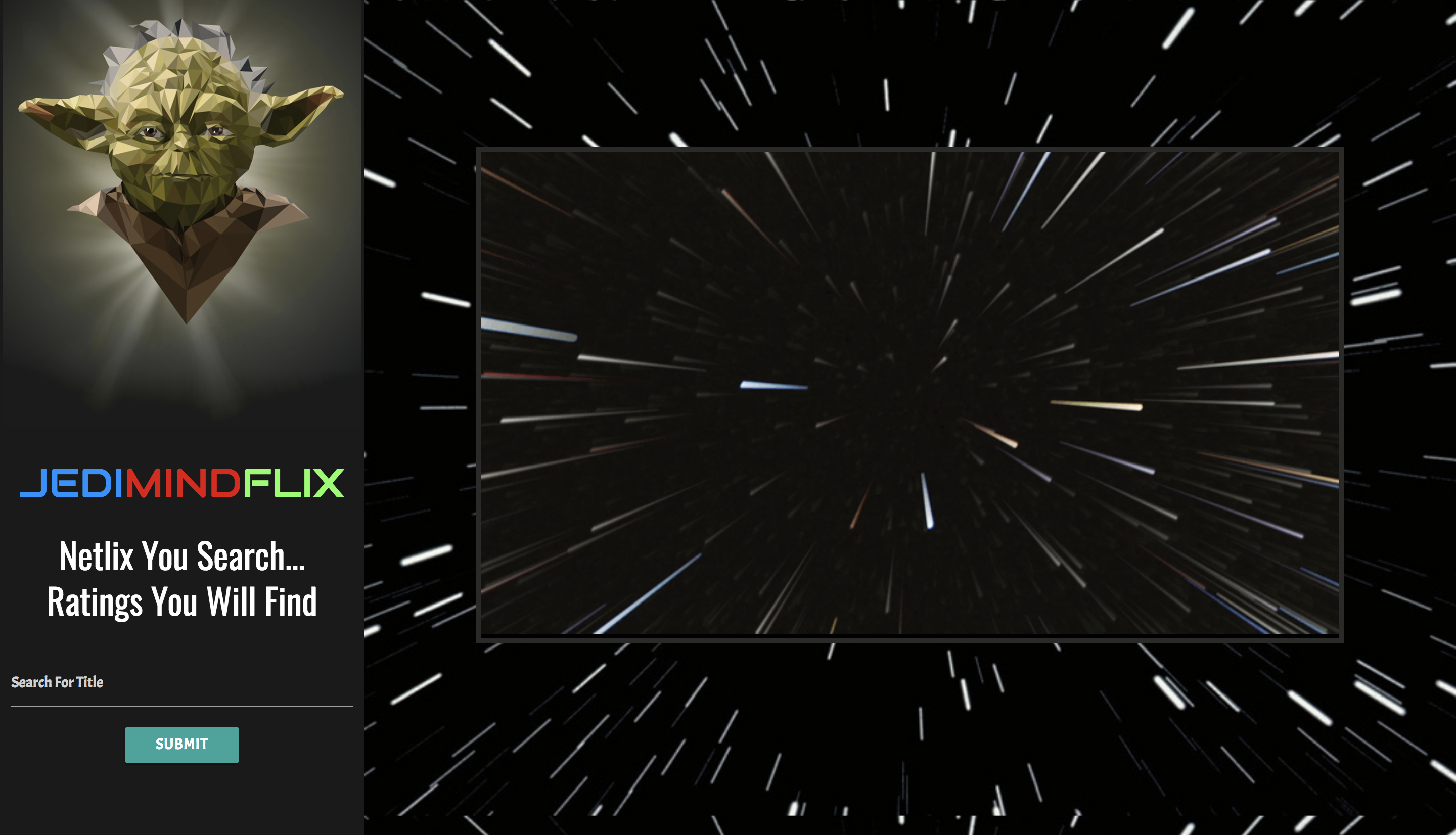 JediMindFlix is an interactive web app made for users to check whats on Netflix. The app is made with HTML and Materialize CSS on the Front-End, with several API's on the backend including "Yoda Speak", "OMDB", and "Netflix Roulette" along with AJAX. Any user can access the app to ask Yoda whether a movie is on Netflix or not, and he will respond in his unique dialect.