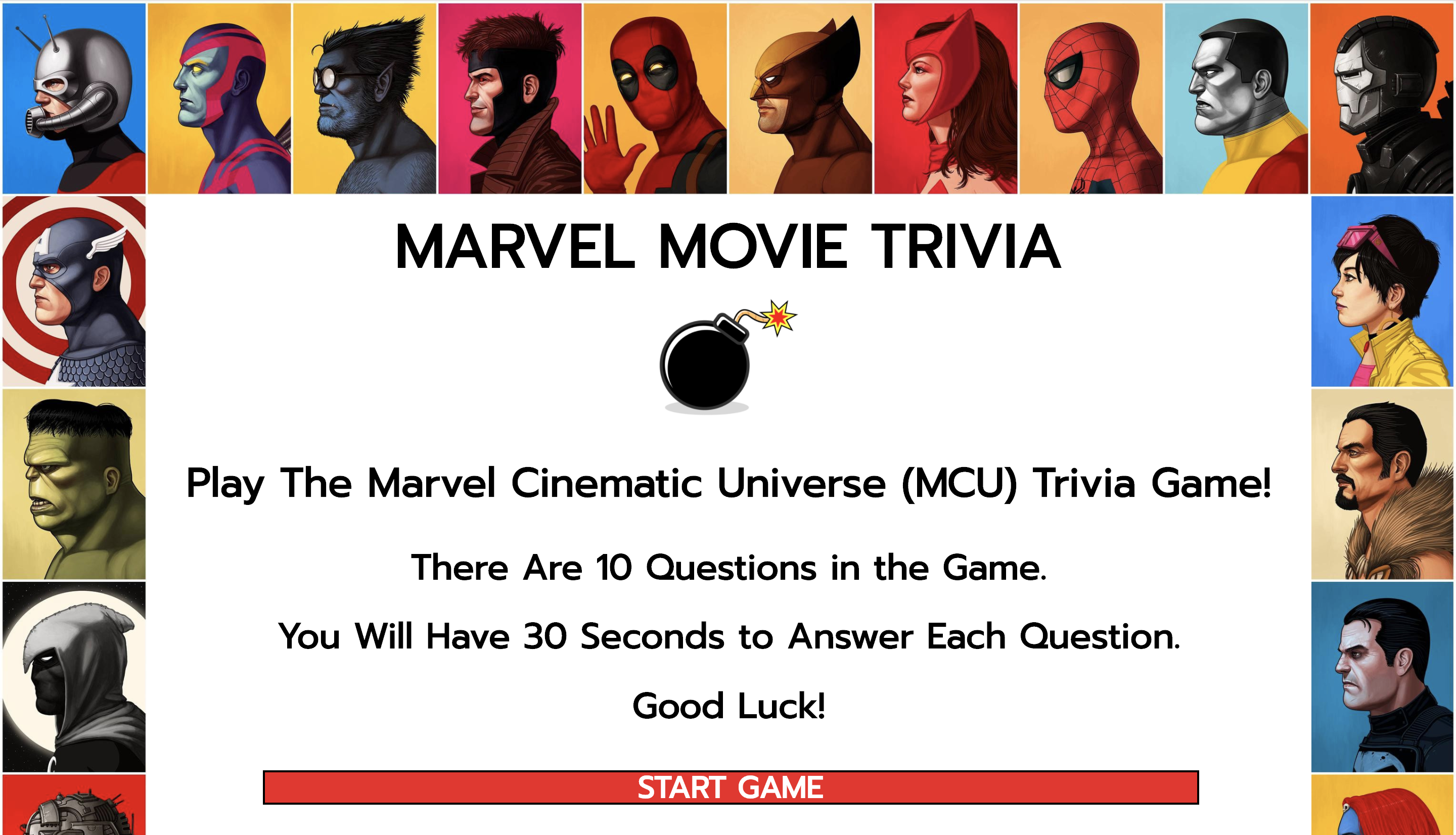 This game is a fun project I made for anyone who is a fan of the Marvel Cinematic Universe. I designed the game with HTML, CSS, JavaScript, and jQuery. Once the user starts the game they will get 30 seconds to answer a question about the MCU. There are 10 questions and each one is worth 10 points. Once the game is over the user will have a score of 0-100% and have the chance to start the game over and play again.