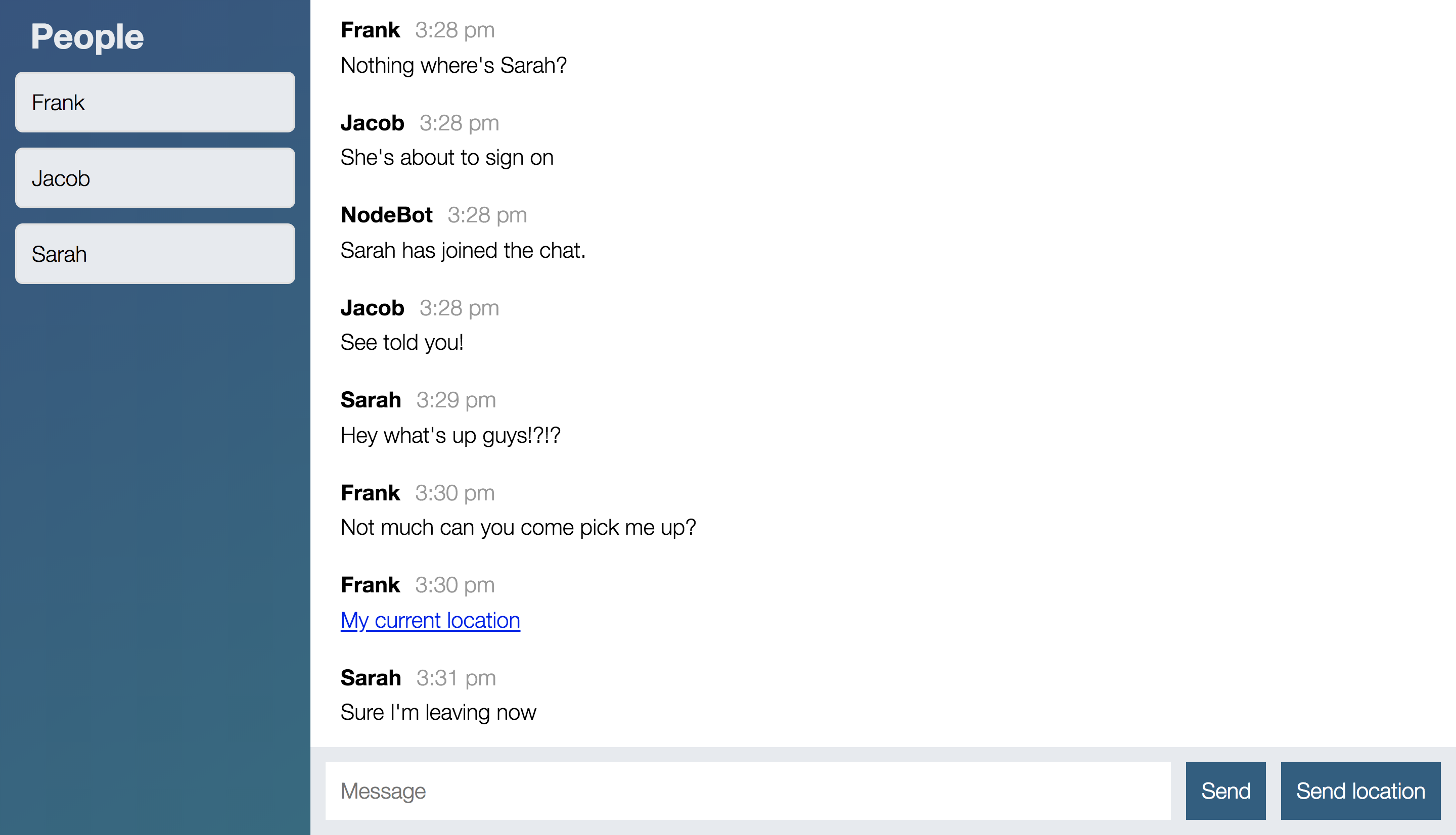 This is a chat room app built with HTML, CSS, JavaScript, jQuery, and Node. The app allows users from any location to join a chat room and send messages to each other in real time. A user can also share their location using the Geolocation API. The app is templated using the mustache.js library. The app uses the npm packages express, socket.io, and moment for production and the packages mocha and expect for testing.