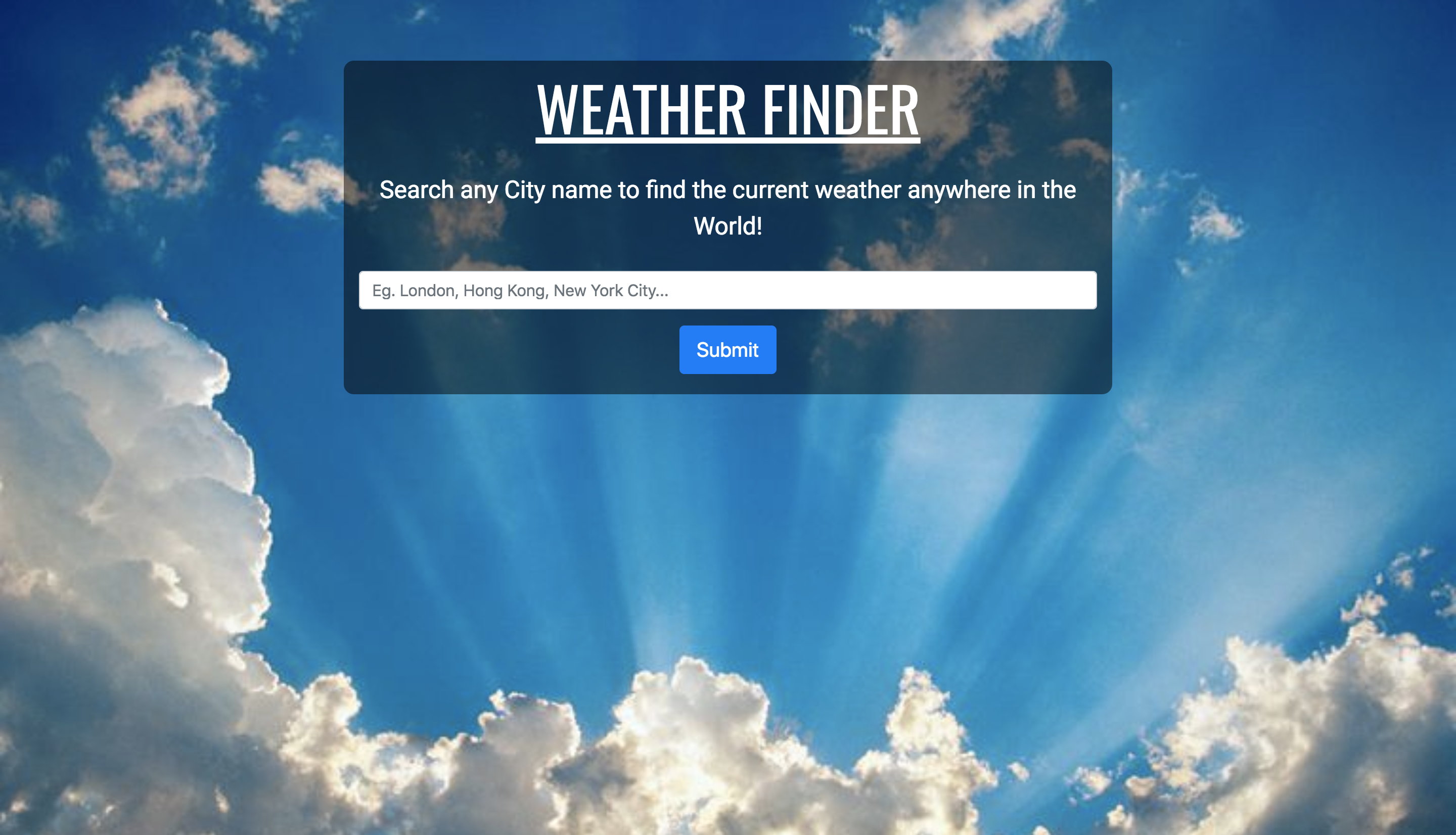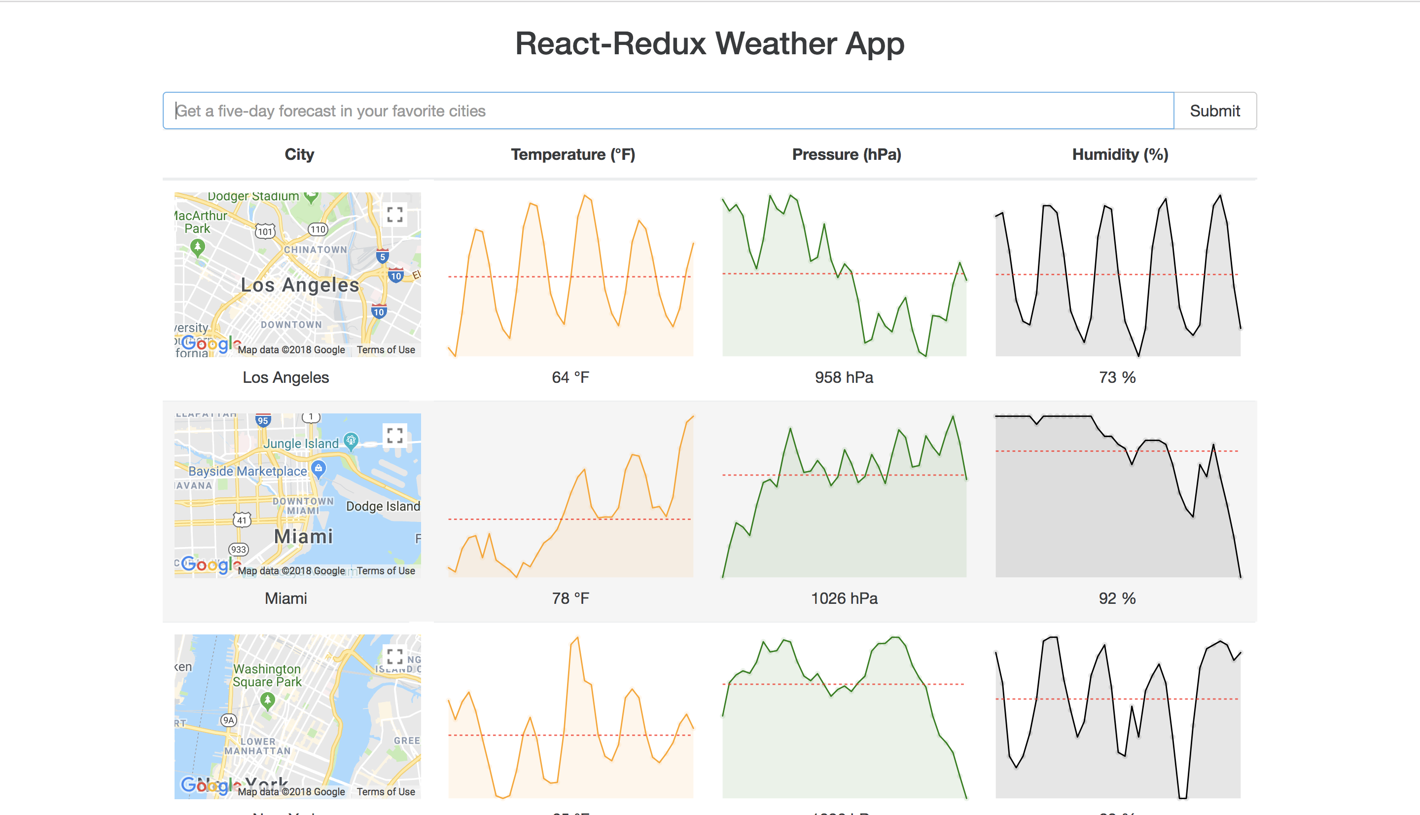 This is a weather data aggregation app created with React and Redux. It was built using the HTML, CSS, and JavaScript coding languages, as well as the axios, react-redux, react-dom, redux-promise node packages. I also used the OpenWeatherMap API to gather the weather data for the city entered by the user and the Google Maps JavaScript API to display a map of the city. The Sparklines node package was used to create a chart display for the different types of weather information the user gets back including temperature, atmospheric pressure, and humidity.