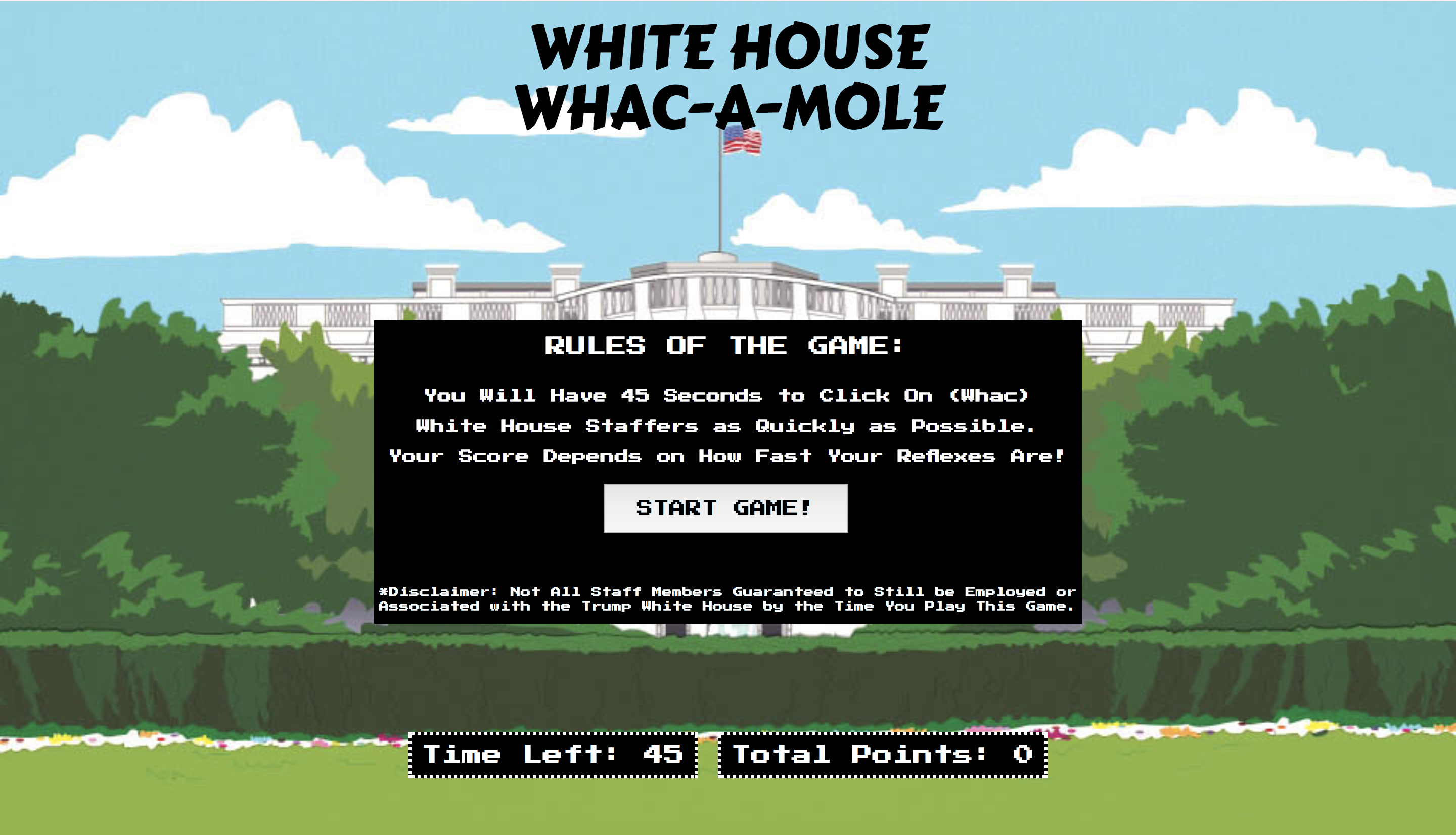 This is a game I made with HTML, CSS, and vanilla JavaScript. The game was made with the sole intention of creating a simple game with some humor added to it. It is not a political statement, should someone find themselves offended. The game is "White House Whac-A-Mole" where White House staff members randomly display on the screen and the user scores points by how quickly they click on them.