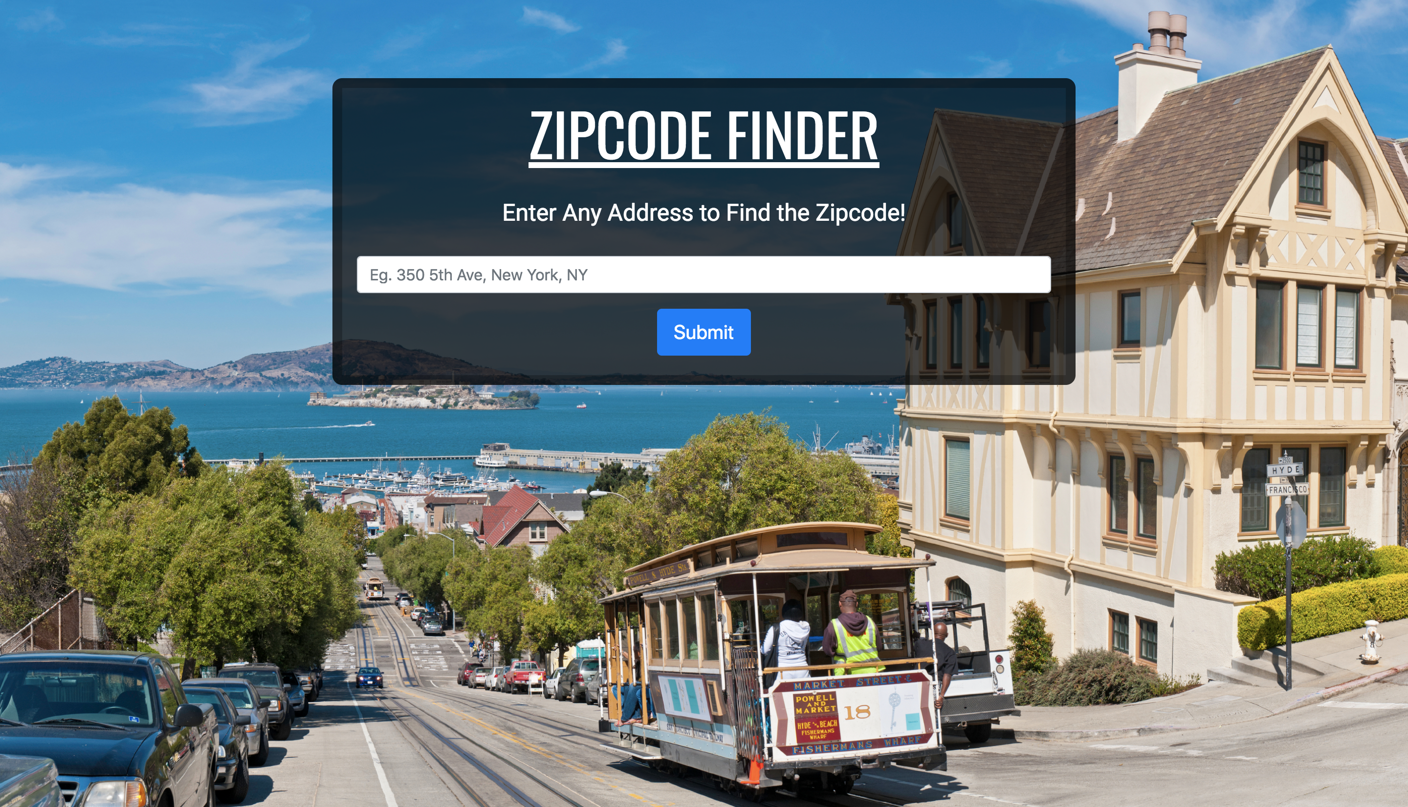This application is designed to help people find the zip code of any address they enter into the search. The app utilizes the Google Maps Geolocation API in order to find the relevant zip code for whatever address a user may wish to look up. The app was built using HTML, CSS, Bootstrap, JavaScript, jQuery, and AJAX.